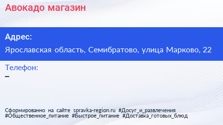 Авокадо, магазин по адресу Ярославская область, Семибратово, улица Марково, 22 в дальнейшем Организация, размещена в следующих категориях: