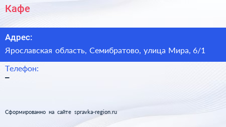 Кафе по адресу Ярославская область, Семибратово, улица Мира, 6/1 в дальнейшем Организация, размещена в следующих категориях: