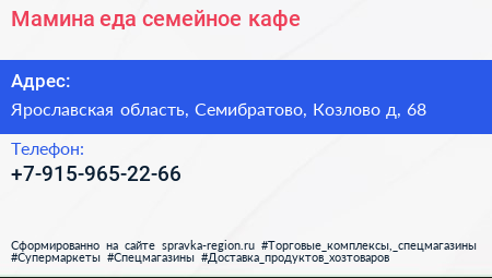 Мамина еда, семейное кафе по адресу Ярославская область, Семибратово, Козлово д, 68 в дальнейшем Организация, размещена в следующих категориях:
