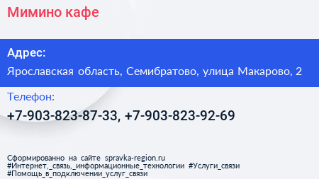 Мимино, кафе по адресу Ярославская область, Семибратово, улица Макарово, 2 в дальнейшем Организация, размещена в следующих категориях: