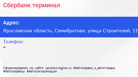 Сбербанк, терминал по адресу Ярославская область, Семибратово, улица Строителей, 11 в дальнейшем Организация, размещена в следующих категориях:
