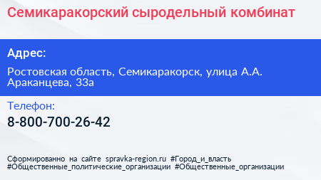 Семикаракорский сыродельный комбинат по адресу Ростовская область, Семикаракорск, улица А.А. Араканцева, 33а в дальнейшем Организация, размещена в следующих категориях: