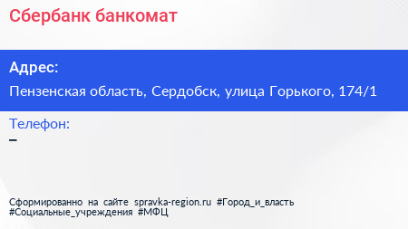 Сбербанк, банкомат по адресу Пензенская область, Сердобск, улица Горького, 174/1 в дальнейшем Организация, размещена в следующих категориях: