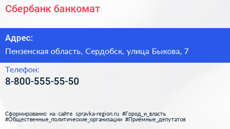 Сбербанк, банкомат по адресу Пензенская область, Сердобск, улица Быкова, 7 в дальнейшем Организация, размещена в следующих категориях: