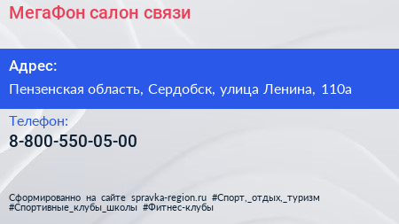 МегаФон, салон связи по адресу Пензенская область, Сердобск, улица Ленина, 110а в дальнейшем Организация, размещена в следующих категориях: