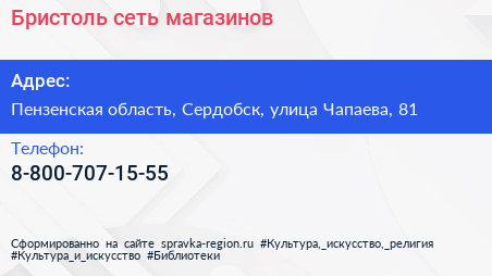 Бристоль, сеть магазинов по адресу Пензенская область, Сердобск, улица Чапаева, 81 в дальнейшем Организация, размещена в следующих категориях: