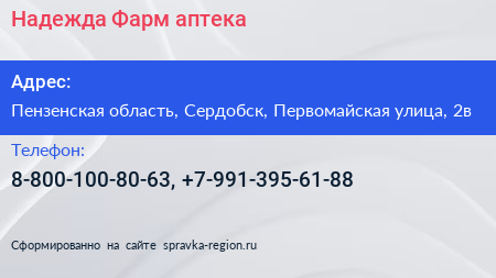 Надежда-Фарм, аптека по адресу Пензенская область, Сердобск, Первомайская улица, 2в в дальнейшем Организация, размещена в следующих категориях: