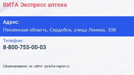 ВИТА Экспресс, аптека по адресу Пензенская область, Сердобск, улица Ленина, 108 в дальнейшем Организация, размещена в следующих категориях: