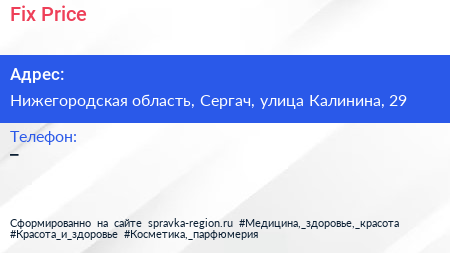Fix Price по адресу Нижегородская область, Сергач, улица Калинина, 29 в дальнейшем Организация, размещена в следующих категориях: