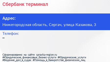 Сбербанк, терминал по адресу Нижегородская область, Сергач, улица Казакова, 3 в дальнейшем Организация, размещена в следующих категориях: