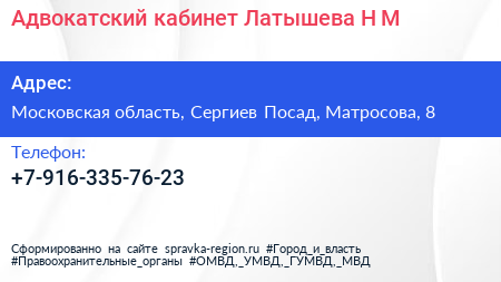 Адвокатский кабинет Латышева Н.М. по адресу Московская область, Сергиев Посад, Матросова, 8 в дальнейшем Организация, размещена в следующих категориях: