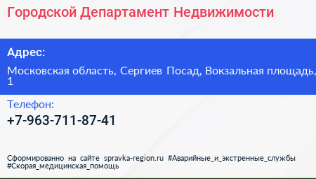 Городской Департамент Недвижимости по адресу Московская область, Сергиев Посад, Вокзальная площадь, 1 в дальнейшем Организация, размещена в следующих категориях: