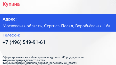 Купина по адресу Московская область, Сергиев Посад, Воробьёвская, 16а в дальнейшем Организация, размещена в следующих категориях:
