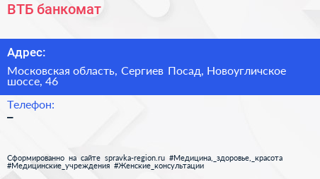 ВТБ, банкомат по адресу Московская область, Сергиев Посад, Новоугличское шоссе, 46 в дальнейшем Организация, размещена в следующих категориях: