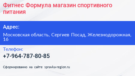 Фитнес Формула, магазин спортивного питания по адресу Московская область, Сергиев Посад, Железнодорожная, 16 в дальнейшем Организация, размещена в следующих категориях: