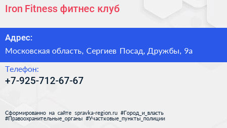 Iron Fitness, фитнес-клуб по адресу Московская область, Сергиев Посад, Дружбы, 9а в дальнейшем Организация, размещена в следующих категориях: