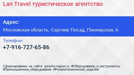 Lan Travel, туристическое агентство по адресу Московская область, Сергиев Посад, Пионерская, 6 в дальнейшем Организация, размещена в следующих категориях: