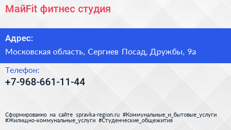 МайFit, фитнес-студия по адресу Московская область, Сергиев Посад, Дружбы, 9а в дальнейшем Организация, размещена в следующих категориях: