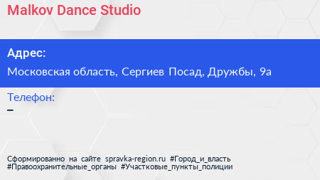 Malkov Dance Studio по адресу Московская область, Сергиев Посад, Дружбы, 9а в дальнейшем Организация, размещена в следующих категориях: