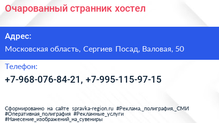 Очарованный странник, хостел по адресу Московская область, Сергиев Посад, Валовая, 50 в дальнейшем Организация, размещена в следующих категориях: