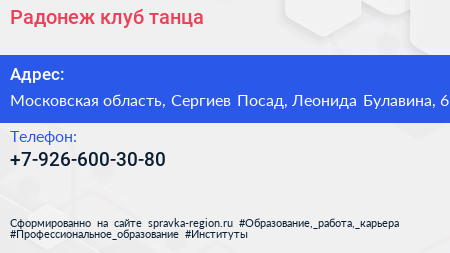 Радонеж, клуб танца по адресу Московская область, Сергиев Посад, Леонида Булавина, 6 в дальнейшем Организация, размещена в следующих категориях: