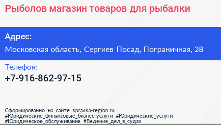 Рыболов, магазин товаров для рыбалки по адресу Московская область, Сергиев Посад, Пограничная, 28 в дальнейшем Организация, размещена в следующих категориях: