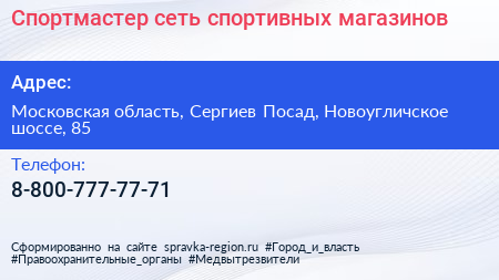 Спортмастер, сеть спортивных магазинов по адресу Московская область, Сергиев Посад, Новоугличское шоссе, 85 в дальнейшем Организация, размещена в следующих категориях: