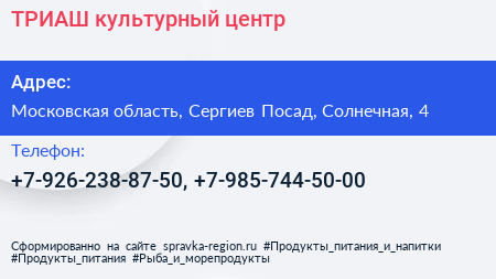 ТРИАШ, культурный центр по адресу Московская область, Сергиев Посад, Солнечная, 4 в дальнейшем Организация, размещена в следующих категориях: