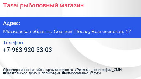 Tasai, рыболовный магазин по адресу Московская область, Сергиев Посад, Вознесенская, 17 в дальнейшем Организация, размещена в следующих категориях: