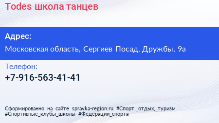 Todes, школа танцев по адресу Московская область, Сергиев Посад, Дружбы, 9а в дальнейшем Организация, размещена в следующих категориях: