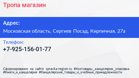 Тропа, магазин по адресу Московская область, Сергиев Посад, Кирпичная, 27а в дальнейшем Организация, размещена в следующих категориях: