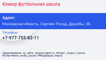 Юниор, футбольная школа по адресу Московская область, Сергиев Посад, Дружбы, 2Б в дальнейшем Организация, размещена в следующих категориях: