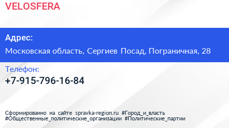 VELOSFERA по адресу Московская область, Сергиев Посад, Пограничная, 28 в дальнейшем Организация, размещена в следующих категориях: