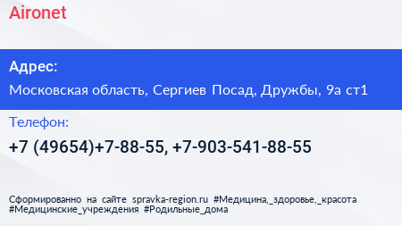 Aironet по адресу Московская область, Сергиев Посад, Дружбы, 9а ст1 в дальнейшем Организация, размещена в следующих категориях: