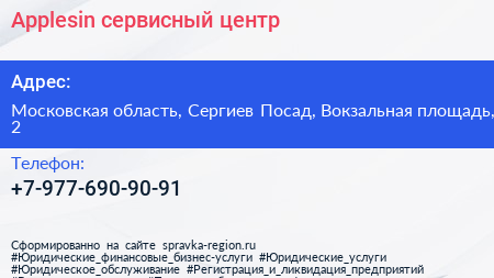 Applesin, сервисный центр по адресу Московская область, Сергиев Посад, Вокзальная площадь, 2 в дальнейшем Организация, размещена в следующих категориях: