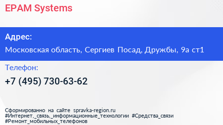 EPAM Systems по адресу Московская область, Сергиев Посад, Дружбы, 9а ст1 в дальнейшем Организация, размещена в следующих категориях:
