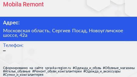 Mobila Remont по адресу Московская область, Сергиев Посад, Новоугличское шоссе, 42а в дальнейшем Организация, размещена в следующих категориях: