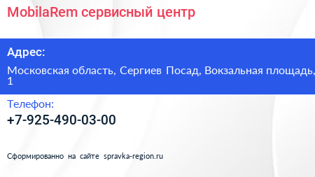 MobilaRem, сервисный центр по адресу Московская область, Сергиев Посад, Вокзальная площадь, 1 в дальнейшем Организация, размещена в следующих категориях: