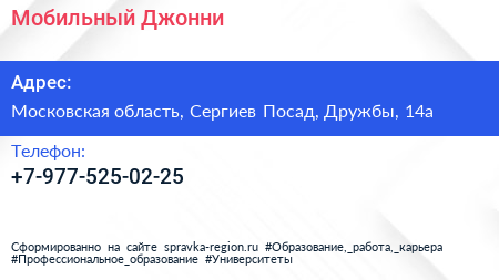 Мобильный Джонни по адресу Московская область, Сергиев Посад, Дружбы, 14а в дальнейшем Организация, размещена в следующих категориях: