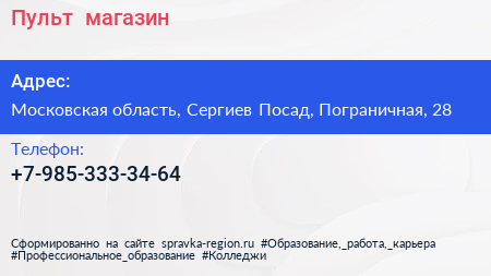 Пульт+, магазин по адресу Московская область, Сергиев Посад, Пограничная, 28 в дальнейшем Организация, размещена в следующих категориях: