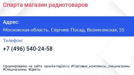 Спарта, магазин радиотоваров по адресу Московская область, Сергиев Посад, Вознесенская, 55 в дальнейшем Организация, размещена в следующих категориях:
