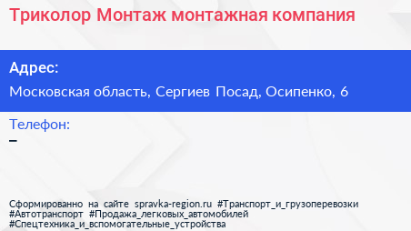 Триколор Монтаж, монтажная компания по адресу Московская область, Сергиев Посад, Осипенко, 6 в дальнейшем Организация, размещена в следующих категориях: