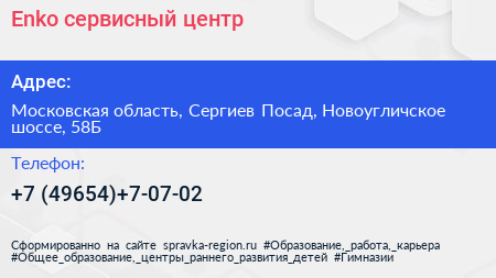 Enko, сервисный центр по адресу Московская область, Сергиев Посад, Новоугличское шоссе, 58Б в дальнейшем Организация, размещена в следующих категориях: