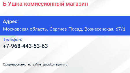 Б/Ушка, комиссионный магазин по адресу Московская область, Сергиев Посад, Вознесенская, 67/1 в дальнейшем Организация, размещена в следующих категориях: