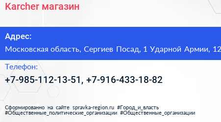 Karcher, магазин по адресу Московская область, Сергиев Посад, 1 Ударной Армии, 12 в дальнейшем Организация, размещена в следующих категориях: