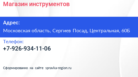Магазин инструментов по адресу Московская область, Сергиев Посад, Центральная, 60Б в дальнейшем Организация, размещена в следующих категориях: