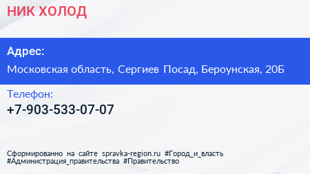 НИК ХОЛОД по адресу Московская область, Сергиев Посад, Бероунская, 20Б в дальнейшем Организация, размещена в следующих категориях: