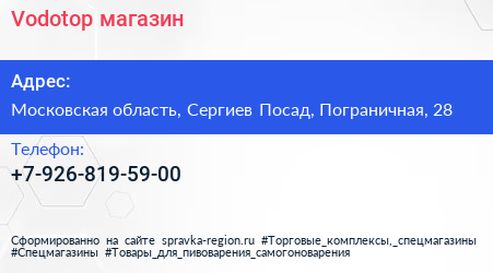 Vodotop, магазин по адресу Московская область, Сергиев Посад, Пограничная, 28 в дальнейшем Организация, размещена в следующих категориях: