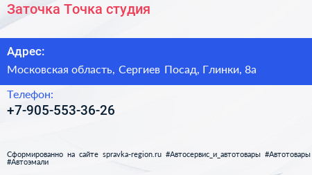 Заточка Точка, студия по адресу Московская область, Сергиев Посад, Глинки, 8а в дальнейшем Организация, размещена в следующих категориях: