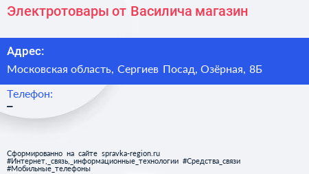 Электротовары от Василича, магазин по адресу Московская область, Сергиев Посад, Озёрная, 8Б в дальнейшем Организация, размещена в следующих категориях: